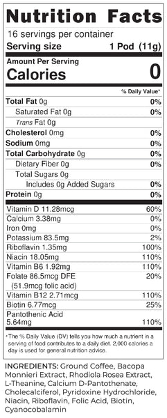 Ground Coffee, Bacopa Monnieri Extract, Rhodiola Rosea Extract, L-Theanine, Calcium D-Pantothenate, Cholecalciferol, Pyridoxine Hydrochloride, Niacin, Riboflavin, Folic Acid, Biotin, Cyanocobalamin