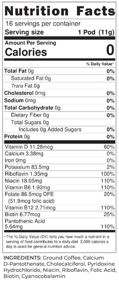 Ground Coffee, Calcium D-Pantothenate, Cholecalciferol, Pyridoxine Hydrochloride, Niacin, Riboflavin, Folic Acid, Biotin, Cyanocobalamin